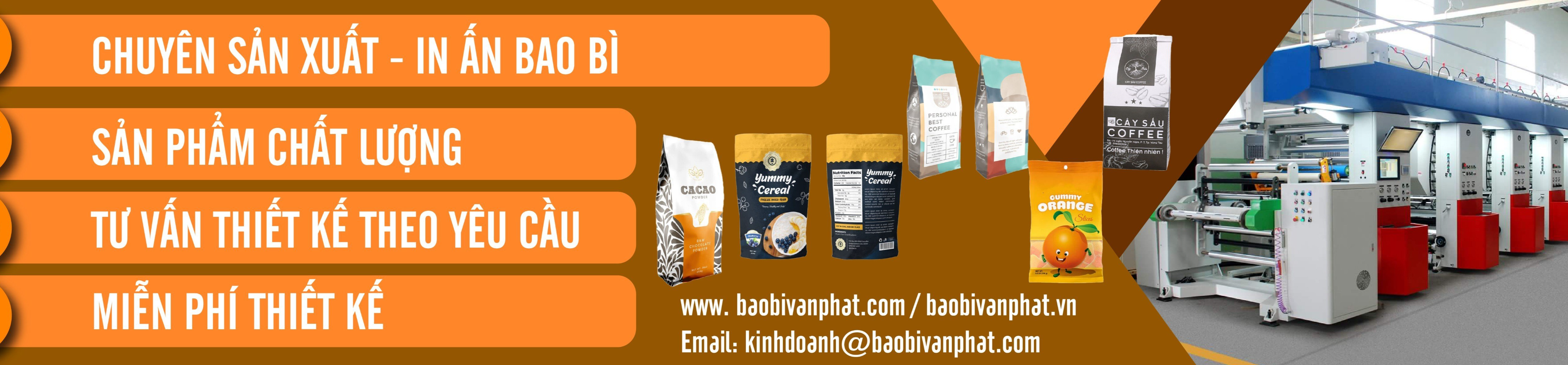 Công ty bao bì Vạn Phát là công ty chuyên sản xuất , in ấn , thiết kế tạo mẫu mã bao bì với hình thức in ống đồng từ 1 đến 8 mà u , sản xuất các loại bao bì dạng cuộn và dạng túi dùng để đóng gói bằng tay hoặc đóng gói tự động.