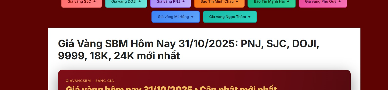 Giá Vàng SBM (GiaVangSBM) cung cấp dữ liệu giá vàng chính xác, cập nhật liên tục các thương hiệu lớn, kết hợp biểu đồ trực quan, phân tích xu hướng, dự báo giá và tin tức thị trường để người dùng theo dõi, dự đoán và đưa ra quyết định mua bán vàng hiệu quả.