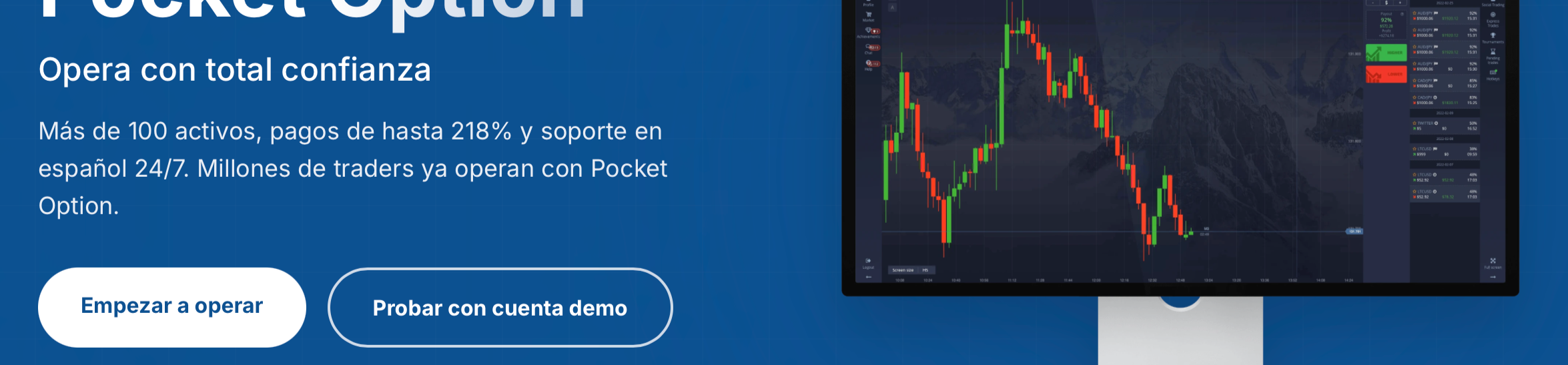 Pocket Option es un broker en lÃnea que en los últimos años se ha vuelto cada vez más conocido entre inversionistas minoristas y también entre operadores profesionales. La plataforma destaca por su diseño fácil de usar y por un proceso de registro simple.