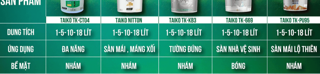 TAIKO GROUP hiện cung cấp hệ thống sơn chống thấm đa dạng, được nghiên cứu và sản xuất theo công nghệ tiên tiến, phù hợp với điều kiện khí hậu nhiệt đới gió mùa tại Việt Nam. Danh mục sản phẩm bao gồm: