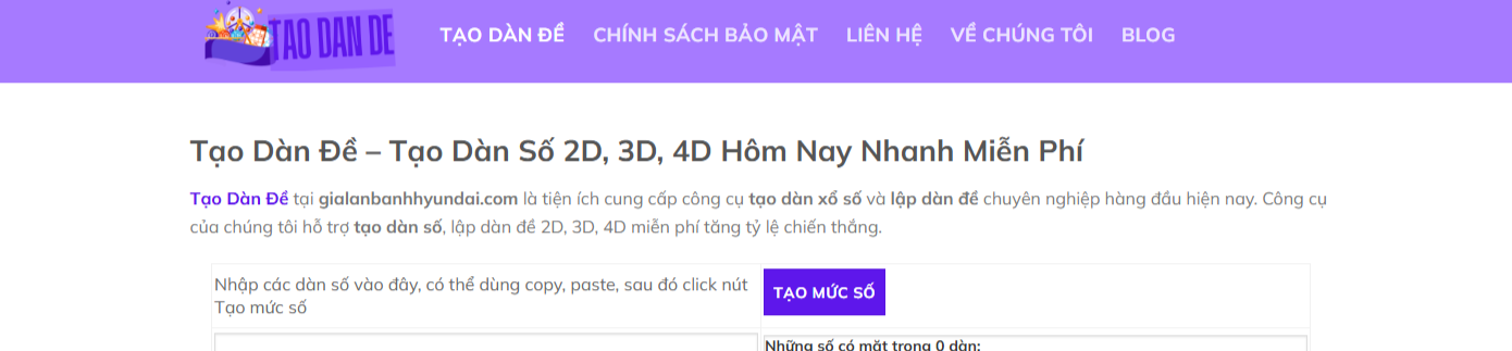 Tạo Dàn Đề tại gialanbanhhyundai.com là tiện ích cung cấp công cụ tạo dàn xổ số và lập dàn đề chuyên nghiệp hàng đầu hiện nay. Công cụ của chúng tôi hỗ trợ tạo dàn số, lập dàn đề 2D, 3D, 4D miễn phí tăng tỷ lệ chiến thắng.